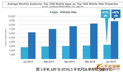 圖1:手機APP與HTML5手機網(wǎng)站使用用戶量對比